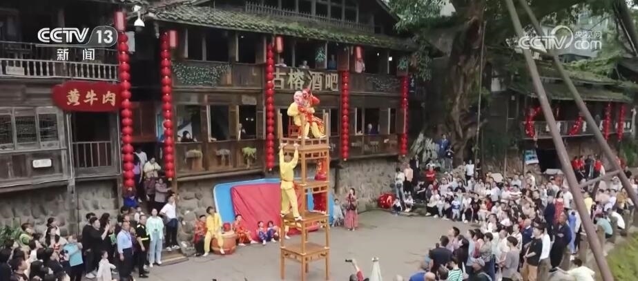 在四川洪雅縣的柳江古鎮(zhèn),當?shù)赝瞥鰧嵕把莩觥⒔?jīng)典誦讀、非遺巡演等多項活動。游客們漫步于山水如畫的詩意古鎮(zhèn)中,觀看水上實景演出,感受非遺民俗魅力,歡度假期。