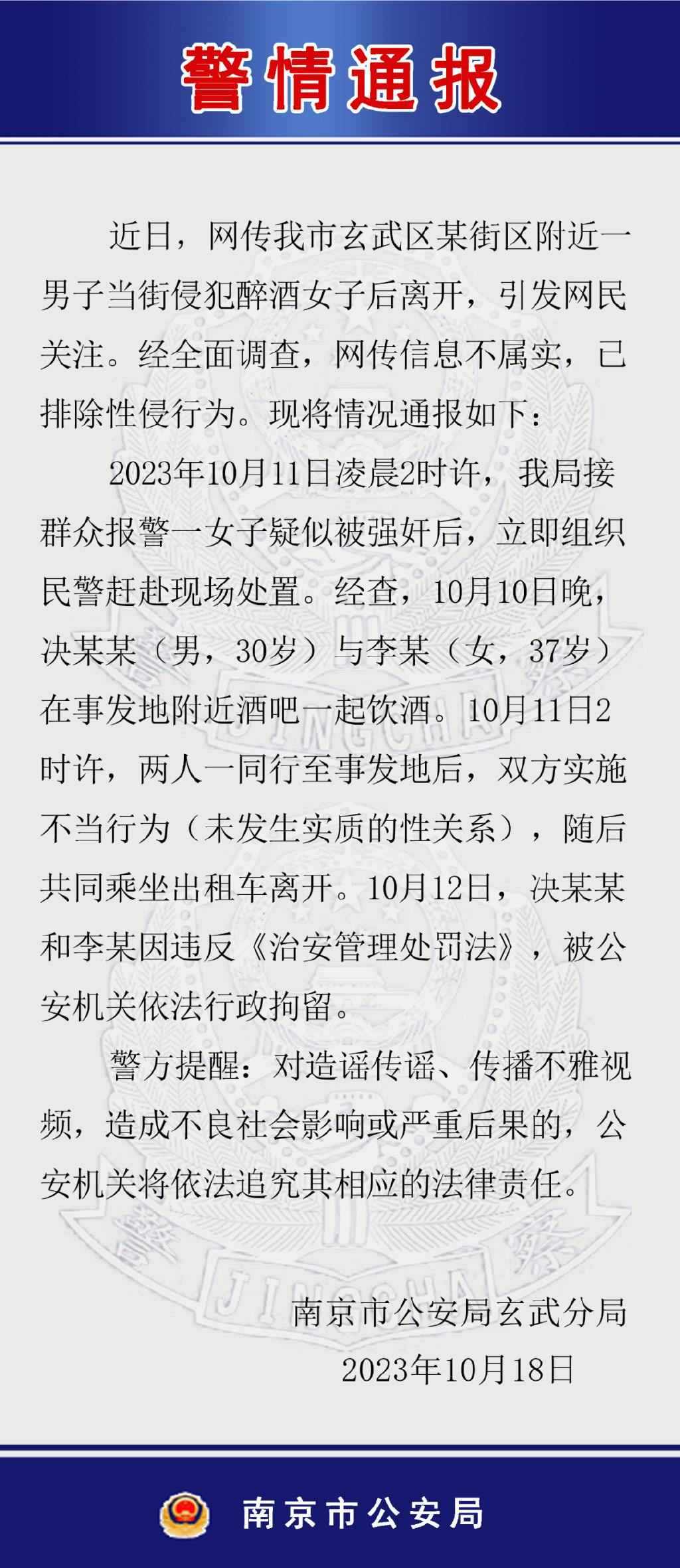 ·南京警方通報(bào)網(wǎng)傳男子當(dāng)街侵犯女子:排除性侵,二人被行拘。
