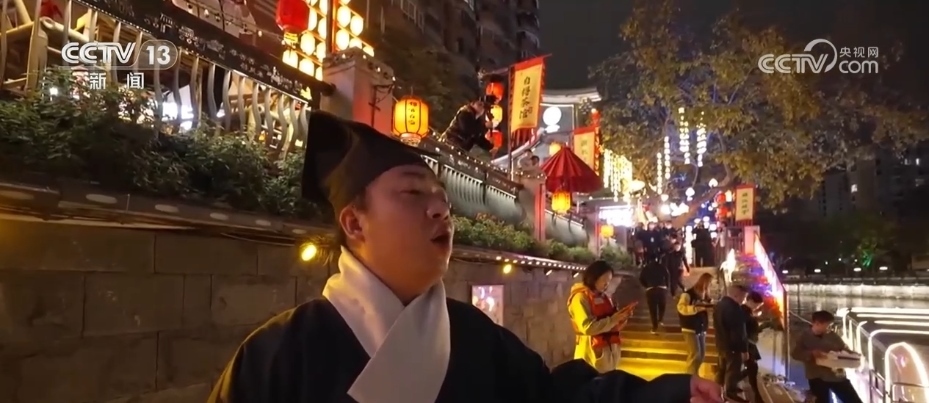 夜幕降臨,華燈初上,在成都東門碼頭,身穿漢服的演員或是在點茶待客,或是在與游客對詩。一曲罷后,游客登上游船,不僅可以欣賞菩提燈光秀,還可以品味曲藝壩壩茶感受優(yōu)雅詩意。
