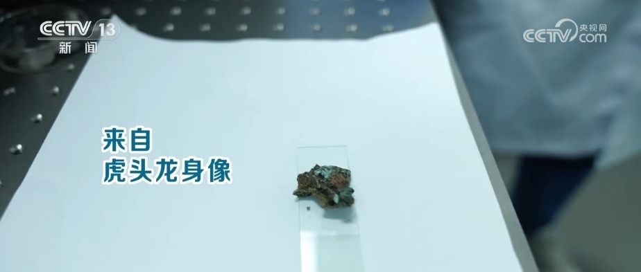 四川省文物考古研究院館員 肖慶:這件樣品是從8號坑的虎頭龍身像上取下來的樣品。這件器物的特別之處就是在它的底座上,有很多紅顏色類似顏料樣的東西。現(xiàn)在要做的就是來確定這個紅色的顏料到底是什么物質。