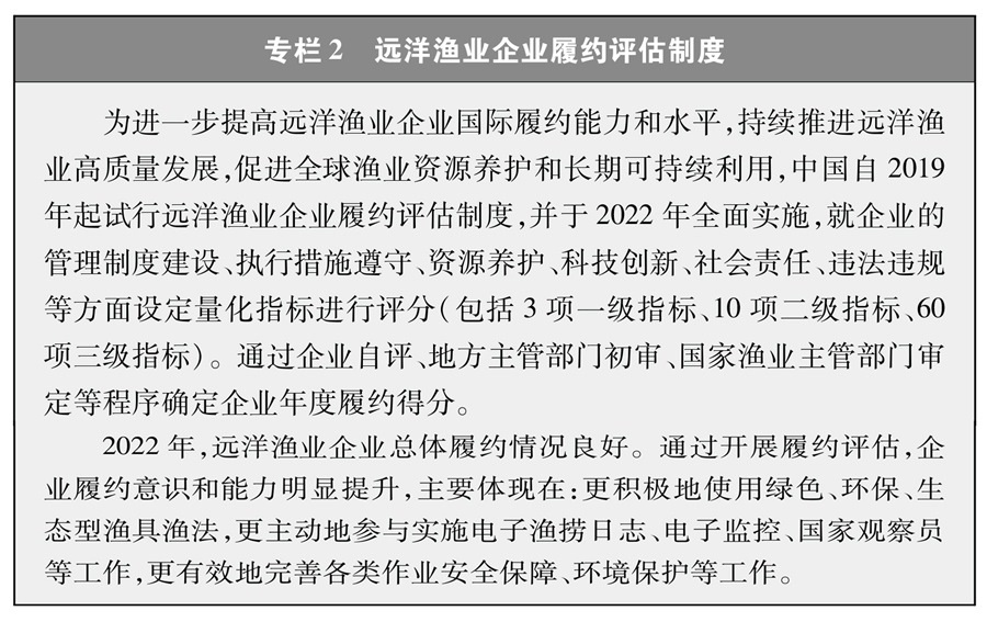 遠(yuǎn)洋漁業(yè)企業(yè)和漁船是履行國(guó)際公約、合法合規(guī)從事漁業(yè)生產(chǎn)的主體。2022年中國(guó)正式實(shí)施遠(yuǎn)洋漁業(yè)企業(yè)履約評(píng)估制度,將企業(yè)履約成績(jī)與行政審批、政策支持等掛鉤,通過(guò)正向激勵(lì)、反向倒逼的方式,引導(dǎo)企業(yè)不斷完善管理制度,嚴(yán)格執(zhí)行管理措施,避免發(fā)生違規(guī)行為,切實(shí)提高履約能力。這一制度有力促進(jìn)了遠(yuǎn)洋漁業(yè)企業(yè)規(guī)范管理和國(guó)際履約,得到了各方關(guān)注和廣泛認(rèn)可。
