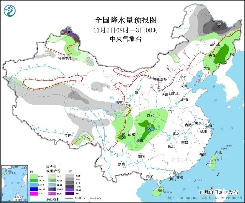 11月2日08時(shí)至3日08時(shí),內(nèi)蒙古東部、黑龍江中北部、新疆北部和南疆盆地南部、西藏北部和東部、青海南部、甘肅西南部等地部分地區(qū)有小到中雪或雨夾雪,其中,新疆阿勒泰北部、黑龍江西北部等地部分地區(qū)有大到暴雪,局地大暴雪(20~25毫米);黑龍江東部、吉林中東部、遼寧北部、陜西南部、四川中東部、重慶、貴州北部、湖北西部、河南西部、海南島、臺(tái)灣島等地部分地區(qū)有小到中雨,其中,四川中部、重慶東北部等地局地有大雨(25~45毫米)。內(nèi)蒙古中東部、吉林中部、遼寧東部、陜西北部等地部分地區(qū)有5~6級(jí)風(fēng)(見(jiàn)圖2)。