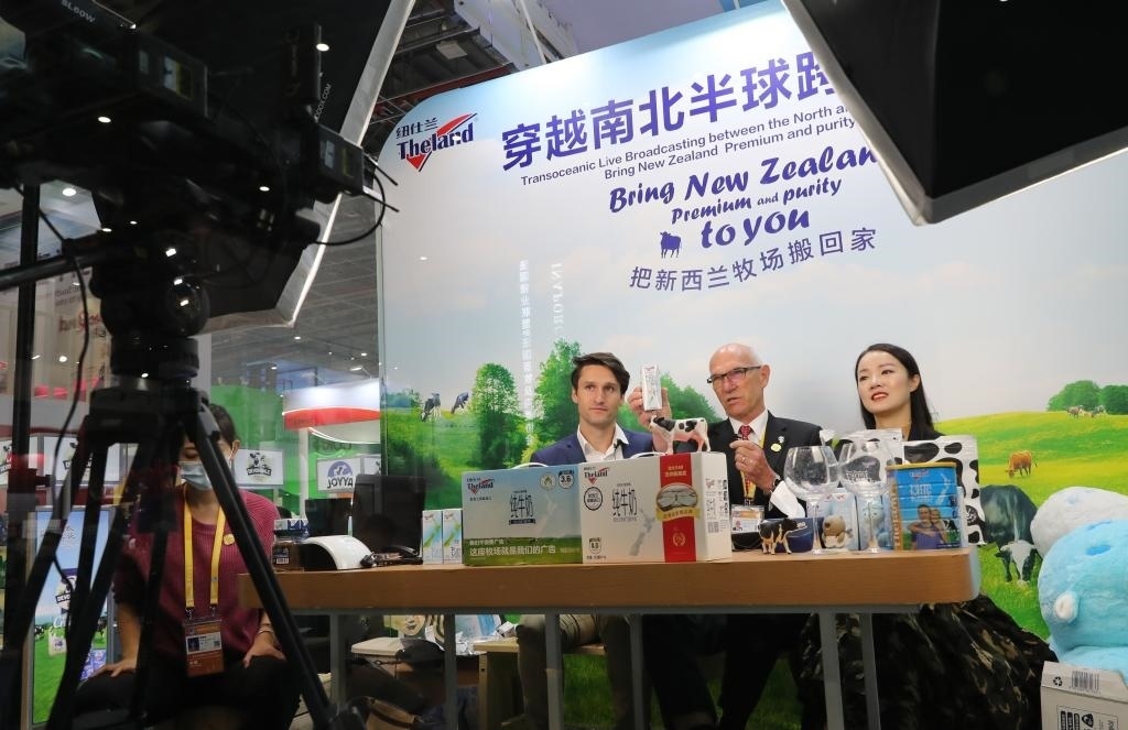 新西蘭紐仕蘭乳業(yè)有限公司執(zhí)行總裁羅伊·范登克(中)在第三屆進(jìn)博會(huì)展臺(tái)上搭建的網(wǎng)絡(luò)直播間出鏡帶貨。新華社記者方喆 攝