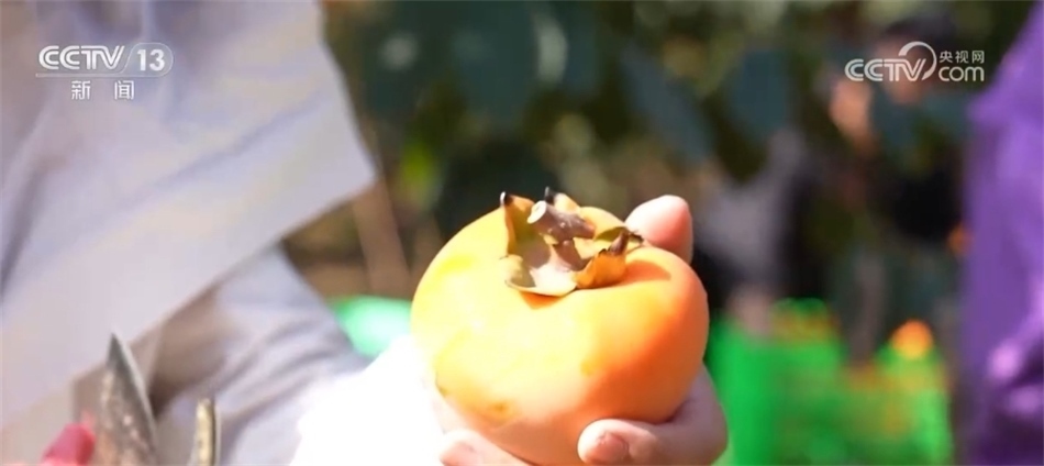 總臺(tái)記者 譚海梅:像水滴一樣的富平尖柿,它的果實(shí)是比較硬的,因?yàn)楦黄绞磷又饕怯脕?lái)做柿餅,所以從樹(shù)上到我手上,這只是在采摘園里的第一步,還要進(jìn)行第二次的修剪,剪成“丁”字把兒。