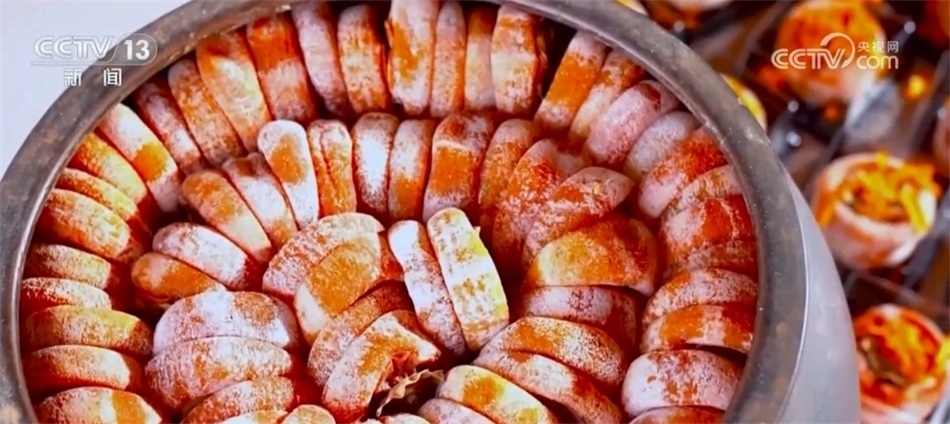 總臺(tái)記者 譚海梅:從削皮到吊掛到晾曬,這中間還得在經(jīng)過(guò)三次的“捏心”,讓這里面的糖分能夠很好地釋放,從霜降一直到冬至,富平柿子才會(huì)成為口齒留香的柿餅。