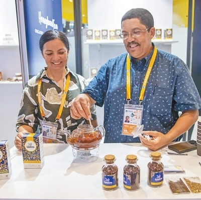 在食品及農(nóng)產(chǎn)品展區(qū),南非參展商展示當?shù)靥禺a(chǎn)蜜樹茶。本報記者 張武軍攝