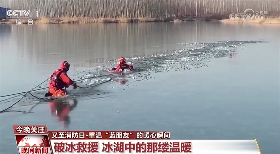 這是在今年年初,冒著凜冽刺骨的低溫,匍匐前進(jìn)的消防員正在接近落冰者,冰水的浸泡已經(jīng)使落冰者失去了自主行動的能力,只能靠消防員拖拽向前。