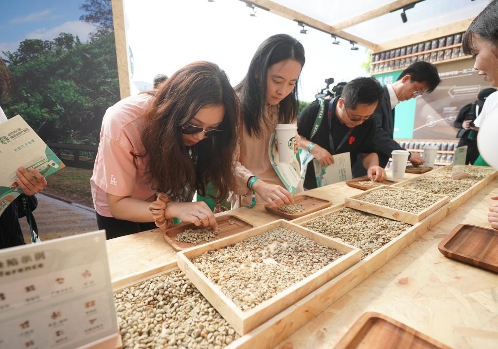 9月19日,在星巴克中國(guó)咖啡創(chuàng)新產(chǎn)業(yè)園開園儀式現(xiàn)場(chǎng),來(lái)賓在體驗(yàn)挑揀咖啡生豆。當(dāng)日,星巴克中國(guó)咖啡創(chuàng)新產(chǎn)業(yè)園在江蘇昆山落成投產(chǎn)。