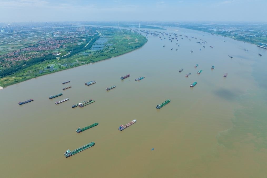 7月5日,船舶在武漢陽邏港區(qū)水域行駛(無人機照片)。新華社記者伍志尊 攝