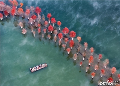 11月14日,初冬時(shí)節(jié),安徽省寧國(guó)市方塘鄉(xiāng)青龍灣濕地的紅杉林美如油畫,游客乘坐竹筏在紅杉林中游覽觀光。
