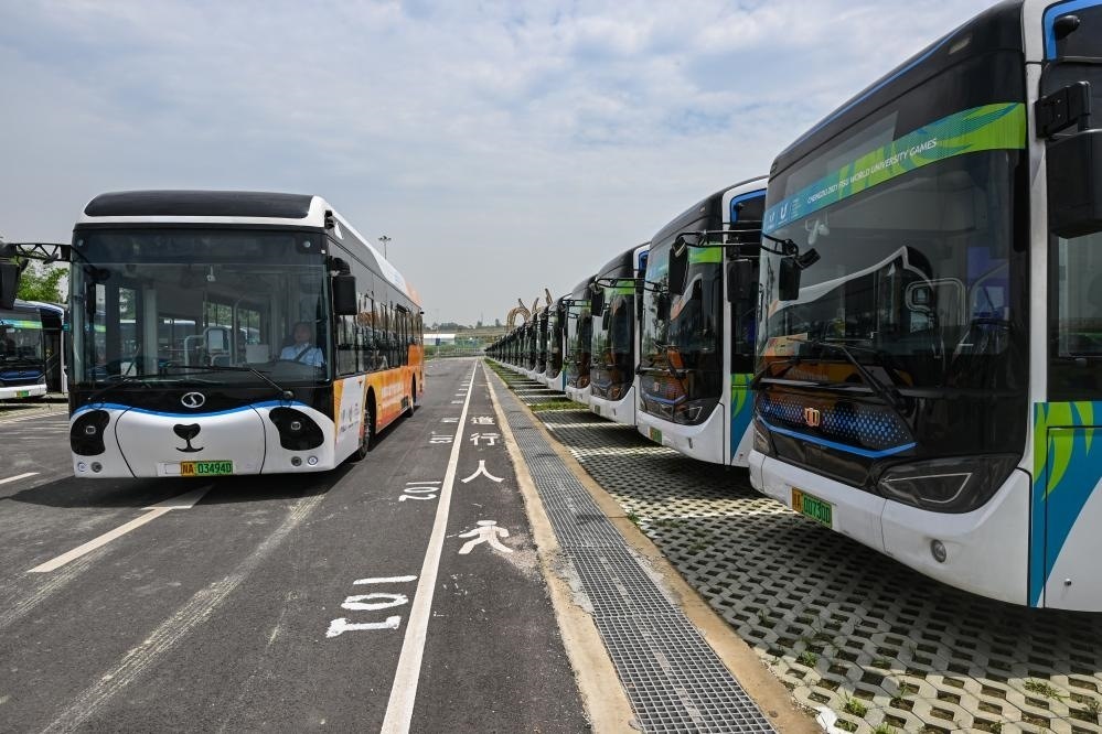 這是負(fù)責(zé)成都第31屆世界大學(xué)生夏季運動會交通保障的新能源公交車。新華社記者王曦 攝
