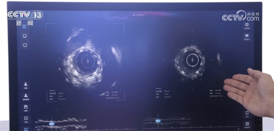 總臺央視記者 褚爾嘉:這里是一個(gè)傳統(tǒng)的血管的超聲圖像,我們可以看到血管的全貌。右邊這里是一個(gè)工作頻率高達(dá)100兆赫茲的超高頻的血管內(nèi)超聲圖像,通過技術(shù)升級,現(xiàn)在我們可以更加清晰地看到冠狀動(dòng)脈的精細(xì)結(jié)構(gòu),這也是目前世界上清晰度最高的一個(gè)血管內(nèi)的超聲圖像。