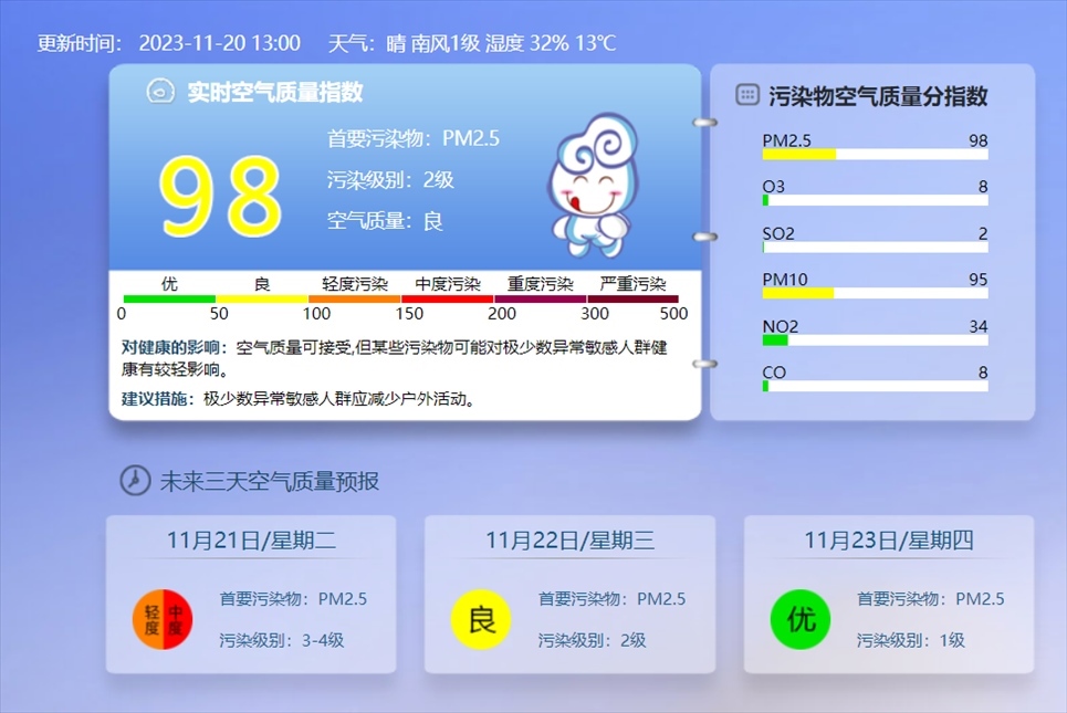 央視網(wǎng)消息:據(jù)@北京環(huán)境監(jiān)測 消息,11月20日13時的實時空氣質(zhì)量指數(shù),北京目前的污染級別達到2級,東城、西城、朝陽、豐臺、通州、房山、大興等區(qū)已顯示為輕度污染。