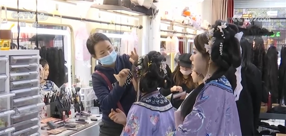這股國(guó)潮風(fēng)也帶動(dòng)了南京漢服的租賃、妝造等周邊產(chǎn)業(yè),離老門(mén)東很近的剪子巷,500米左右的巷子就有20家左右的漢服租賃店。