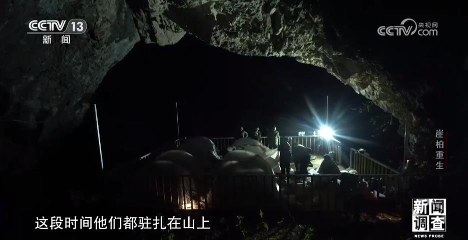 調(diào)查用的工具、保險繩、干糧、帳篷,僅僅是這些必需品,他們的背包就有好幾十斤重。無人區(qū)里沒有路,沿途基本都是密集的樹林和雜草,隊員們只能用砍刀開路。有些崖壁是直接懸空的,根本沒有著力點。隊員們就從山林里找來廢棄的木頭,用鐵絲捆在一起,搭成木橋和圍欄。走了四個多小時,他們終于在一處懸崖發(fā)現(xiàn)了野生崖柏。他們手中的儀器叫做定位器,可以精確記錄崖柏生長地點的經(jīng)緯度和海拔,給科研提供更精確的信息。