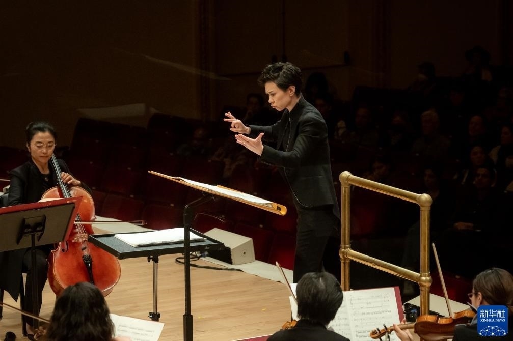 11月24日,中央音樂(lè)學(xué)院指揮家陳琳在美國(guó)紐約卡內(nèi)基音樂(lè)廳執(zhí)棒本次演出。新華社發(fā)(邁克爾·維奧拉果攝)