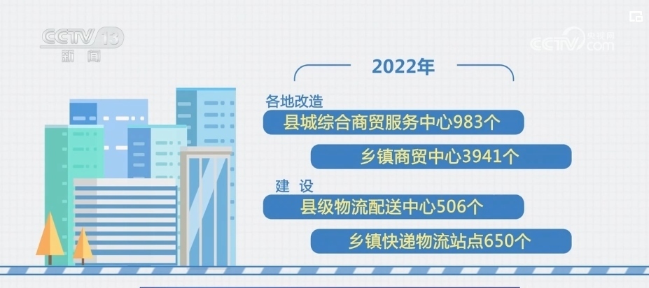 2022年,各地改造縣城綜合商貿(mào)服務(wù)中心983個、鄉(xiāng)鎮(zhèn)商貿(mào)中心3941個,建設(shè)縣級物流配送中心506個、鄉(xiāng)鎮(zhèn)快遞物流站點650個。