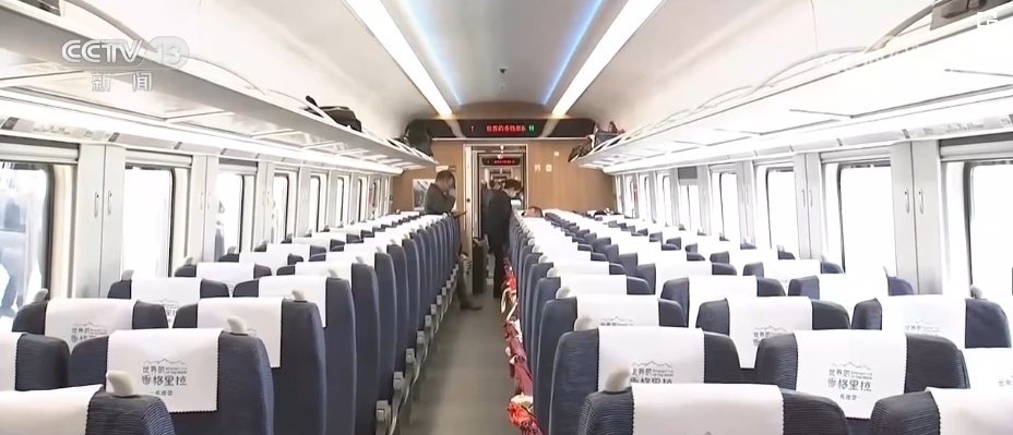 總臺記者 劉文杰:這是一款特別針對滇藏鐵路沿線高原、高寒環(huán)境設(shè)計的動車組。整列車的涂裝是以“中國紅”為腰帶、以“國槐綠”為窗帶,用“長城灰”進(jìn)行點綴,整體外觀大氣優(yōu)美。