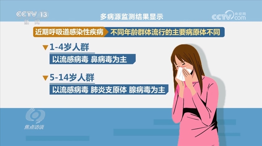 多病源監(jiān)測(cè)結(jié)果顯示,近期呼吸道感染性疾病不同年齡群體流行的主要病原體不同。1—4歲人群以流感病毒、鼻病毒為主,5—14歲人群以流感病毒、肺炎支原體、腺病毒為主,15—59歲人群以流感病毒、鼻病毒、新冠病毒為主,60歲及以上人群以流感病毒、人偏肺病毒和普通冠狀病毒為主。