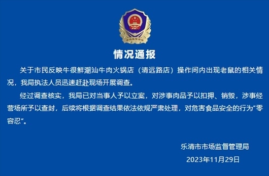 ·溫州樂清官方通報火鍋店現(xiàn)老鼠啃牛排:已對當(dāng)事人予以立案,對涉事肉品予以扣押、銷毀,涉事經(jīng)營場所予以查封。