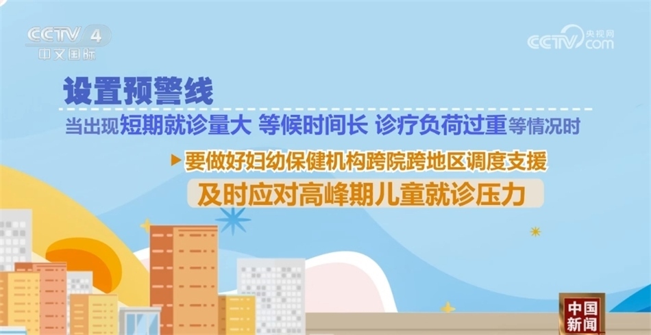 設(shè)置預(yù)警線,當(dāng)出現(xiàn)短期就診量大、等候時(shí)間長(zhǎng)、診療負(fù)荷過(guò)重等情況時(shí),要做好婦幼保健機(jī)構(gòu)跨院跨地區(qū)調(diào)度支援,及時(shí)應(yīng)對(duì)高峰期兒童就診壓力。