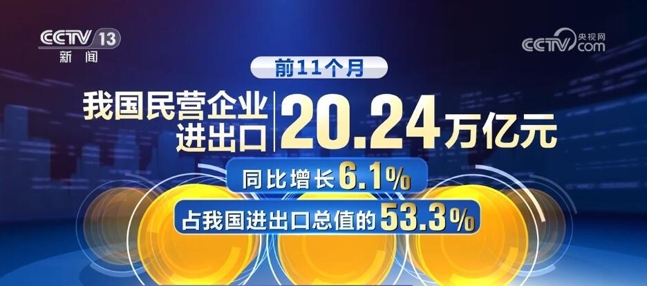 前11個(gè)月,我國(guó)民營(yíng)企業(yè)進(jìn)出口20.24萬(wàn)億元,同比增長(zhǎng)6.1%,占我國(guó)進(jìn)出口總值的53.3%,提升3.1個(gè)百分點(diǎn)。同期,上海、江蘇、浙江、安徽等長(zhǎng)三角區(qū)域合計(jì)進(jìn)出口13.87萬(wàn)億元,同比增長(zhǎng)0.6%,其中出口同比增長(zhǎng)1%,拉動(dòng)同期我國(guó)出口增長(zhǎng)0.4個(gè)百分點(diǎn),強(qiáng)勁活躍的增長(zhǎng)極功能不斷鞏固提升。???????