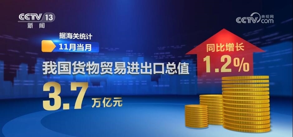 央視網(wǎng)消息:海關(guān)總署今天(12月7日)對(duì)外公布,今年11月份,我國(guó)貨物貿(mào)易進(jìn)出口總值3.7萬(wàn)億元,同比增長(zhǎng)1.2%。數(shù)據(jù)顯示,我國(guó)外貿(mào)穩(wěn)中向好態(tài)勢(shì)進(jìn)一步鞏固。