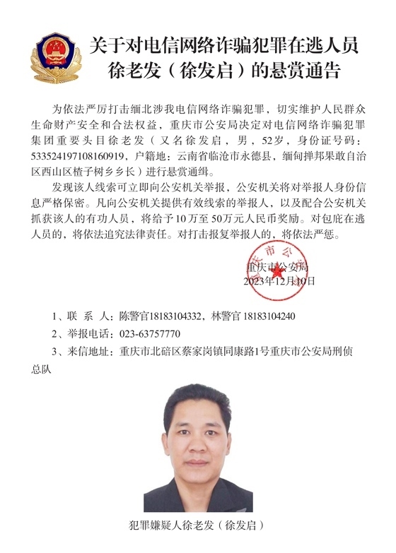 為依法嚴厲打擊緬北涉我電信網(wǎng)絡(luò)詐騙犯罪,切實維護人民群眾生命財產(chǎn)安全和合法權(quán)益,遼寧省大連市公安局決定對白所成、白應(yīng)蒼(又名李云晨)、白應(yīng)蘭(又名李夢娜)進行公開懸賞通緝;福建省泉州市公安局決定對魏懷仁、魏榕(又名陳榕)、魏青松(又名楊松)進行公開懸賞通緝;福建省龍巖市公安局決定對劉正祥、劉積光(又名李華光)、劉正茂進行公開懸賞通緝;重慶市公安局決定對徐老發(fā)(又名徐發(fā)啟)進行公開懸賞通緝。