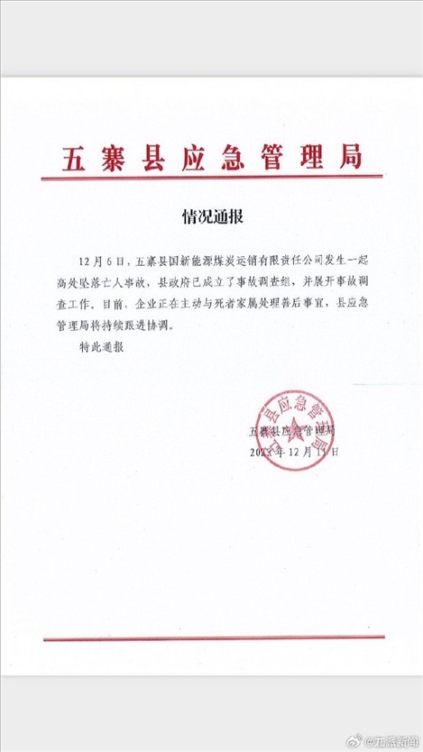 ·國新能源煤炭運銷公司發(fā)生墜亡事故,山西省忻州市五寨縣官方:展開調查。