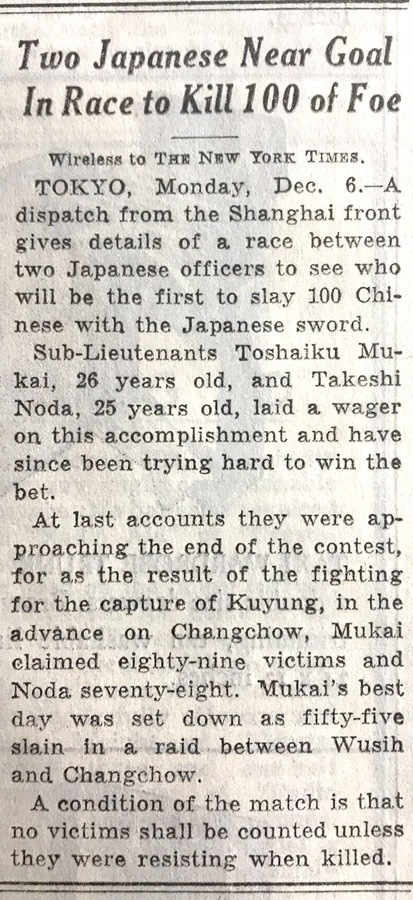 在1937年12月6日發(fā)行的《紐約時(shí)報(bào)》中,也登載了有關(guān)日軍“百人斬”殺人競(jìng)賽的報(bào)道。報(bào)道稱(chēng),來(lái)自上海前線(xiàn)的一份電報(bào)詳細(xì)介紹了兩名日本軍官之間的一場(chǎng)比賽,看誰(shuí)先殺死100名中國(guó)人。年紀(jì)分別為25歲和26歲的日本軍官把賭注壓在了這項(xiàng)“成就”上。