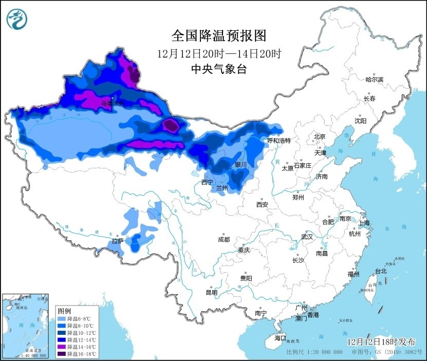 其中,12月12日20時至12月14日20時,新疆、內(nèi)蒙古西部、甘肅、寧夏等地將出現(xiàn)8~12℃降溫,新疆北部、甘肅西部局地降溫可達14℃以上。