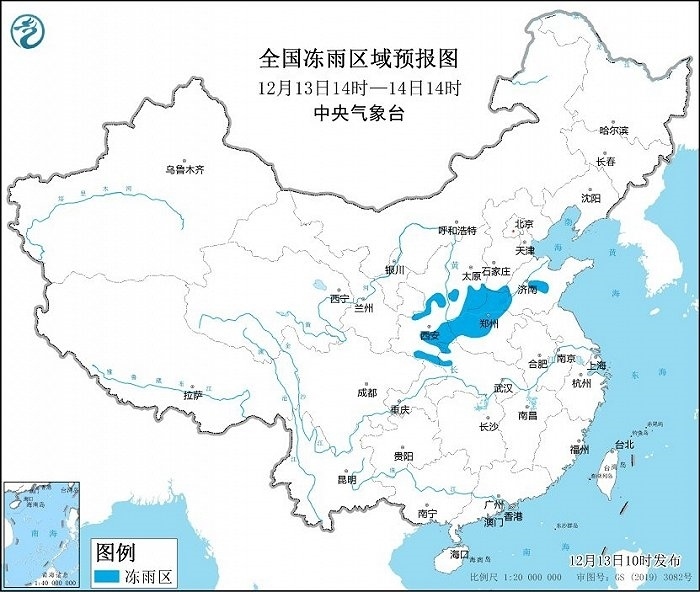 預計,12月13日14時至14日14時,陜北南部和秦嶺東部、山西南部、河南北部和西部、河北南部、山東中部、湖北西北部等地的部分地區(qū)有凍雨。