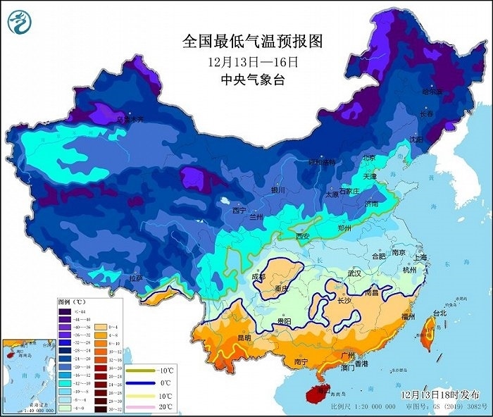 預計,12月13日夜間至16日,一股強寒潮將自新疆開始,自西向東、自北向南影響我國,大部地區(qū)將先后出現(xiàn)4~6級偏北風,氣溫隨之下降8~12℃,西北地區(qū)、內(nèi)蒙古中西部、華北西部和南部、黃淮北部及江淮東部、江南、華南大部、貴州等地的部分地區(qū)降溫可達14℃以上。新疆山口地區(qū)有9~10級、陣風12~13級大風,東部和南部海區(qū)有6~8級、陣風9~10級大風。17日早晨最低氣溫0℃線可南壓至貴州南部和江南北部一帶,-10℃線位于黃淮北部至秦嶺一帶。華北、黃淮北部等地的部分地區(qū)最低氣溫將接近或跌破歷史同期極值。