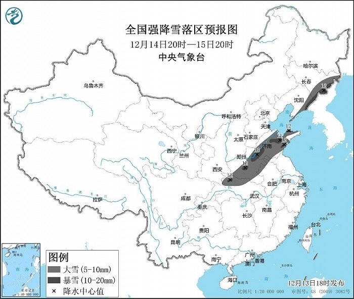 預計12月14日20時至12月15日20時,湖北西北部、河南中東部、山東大部、遼寧東部、吉林東部等地有大雪,局地有暴雪(10~13毫米)。上述部分地區(qū)新增積雪深度5~10厘米,局地可達15厘米以上。