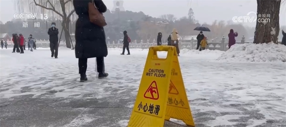北海公園信息傳媒科副科長 張磊:主要是在門區(qū)、洗手間以及重點的景區(qū),同時我們也設置了“小心地滑”的這種提示牌130余處,此次降雪時間由于比較長,公園也采用了“機械+人工掃雪”的這種方式,爭取做到了隨掃隨清,保證主路的暢通。