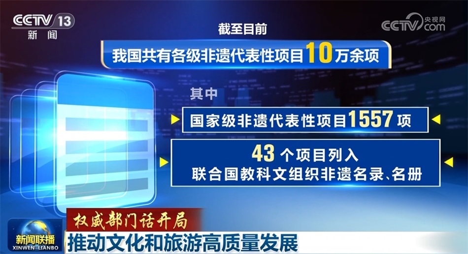 繁榮發(fā)展文化事業(yè)和文化產(chǎn)業(yè),推進(jìn)城鄉(xiāng)公共文化服務(wù)體系提質(zhì)增效。今年前11個(gè)月,文化和旅游部主辦27項(xiàng)展演展示活動(dòng),線下觀眾90萬人次,線上觀看量超過18億次,一批彰顯中華審美風(fēng)范、富有鮮明時(shí)代氣息的舞臺藝術(shù)作品廣受好評。保護(hù)傳承弘揚(yáng)中華優(yōu)秀傳統(tǒng)文化,中華文明探源工程、考古中國等重大項(xiàng)目得以深入實(shí)施,截至目前,我國共有各級非遺代表性項(xiàng)目10萬余項(xiàng),其中國家級非遺代表性項(xiàng)目1557項(xiàng),43個(gè)項(xiàng)目列入聯(lián)合國教科文組織非遺名錄(名冊),中國世界遺產(chǎn)數(shù)量增至57項(xiàng)。