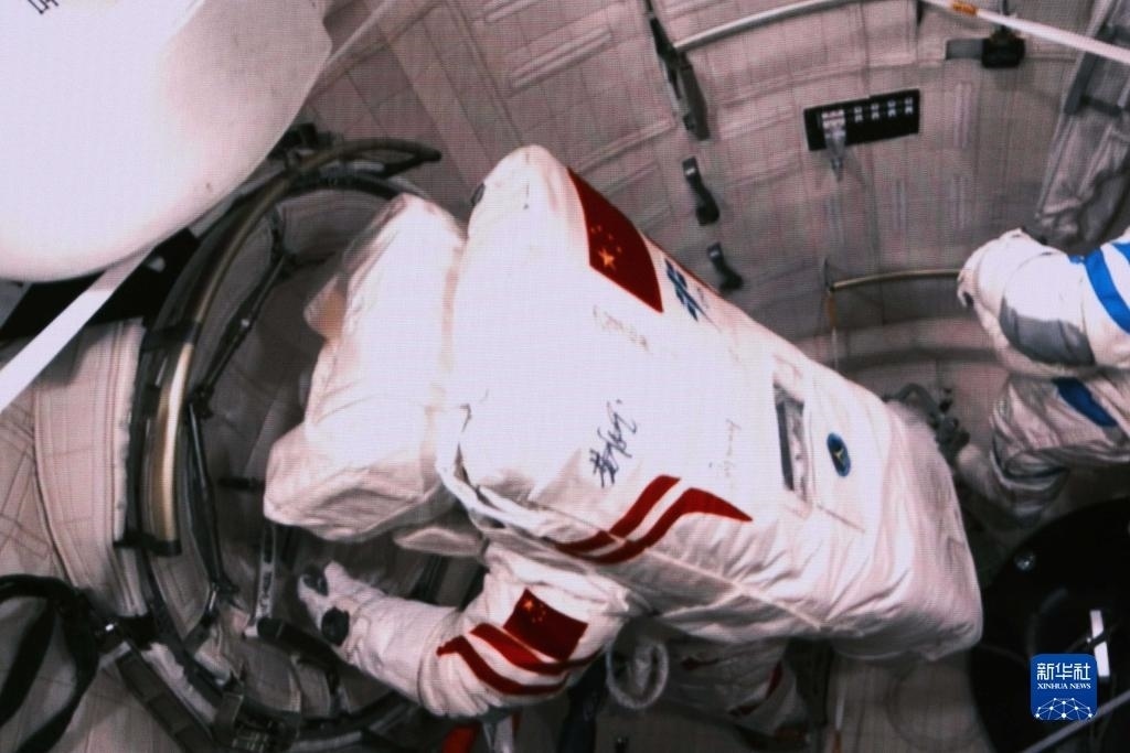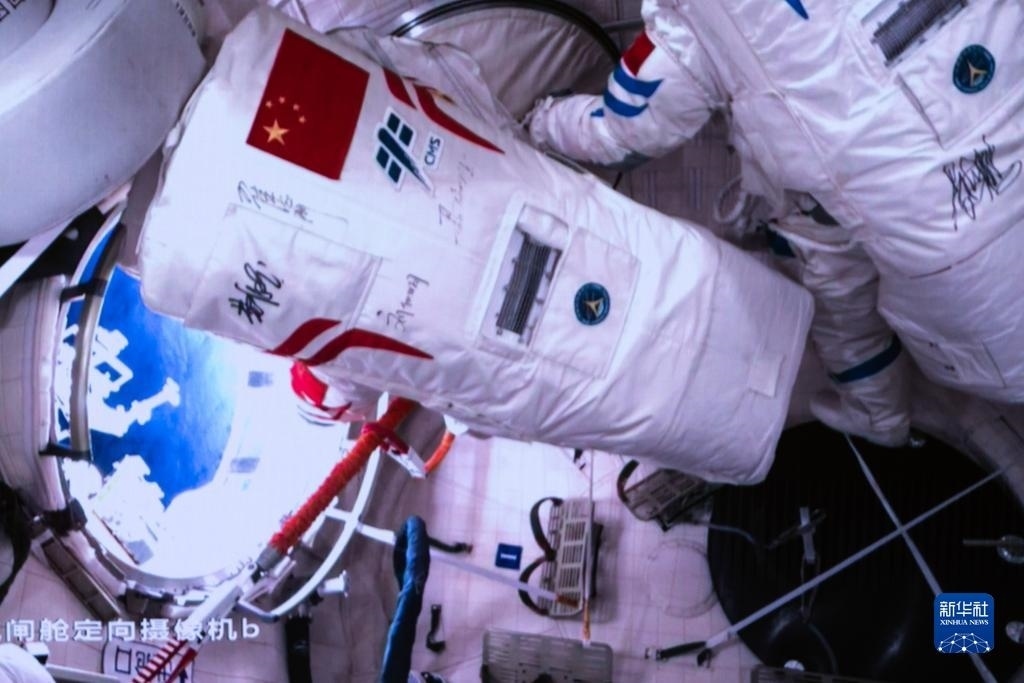 12月21日在北京航天飛行控制中心拍攝的神舟十七號航天員江新林協(xié)同兩名艙外航天員實施出艙活動的畫面。新華社記者 李杰 攝