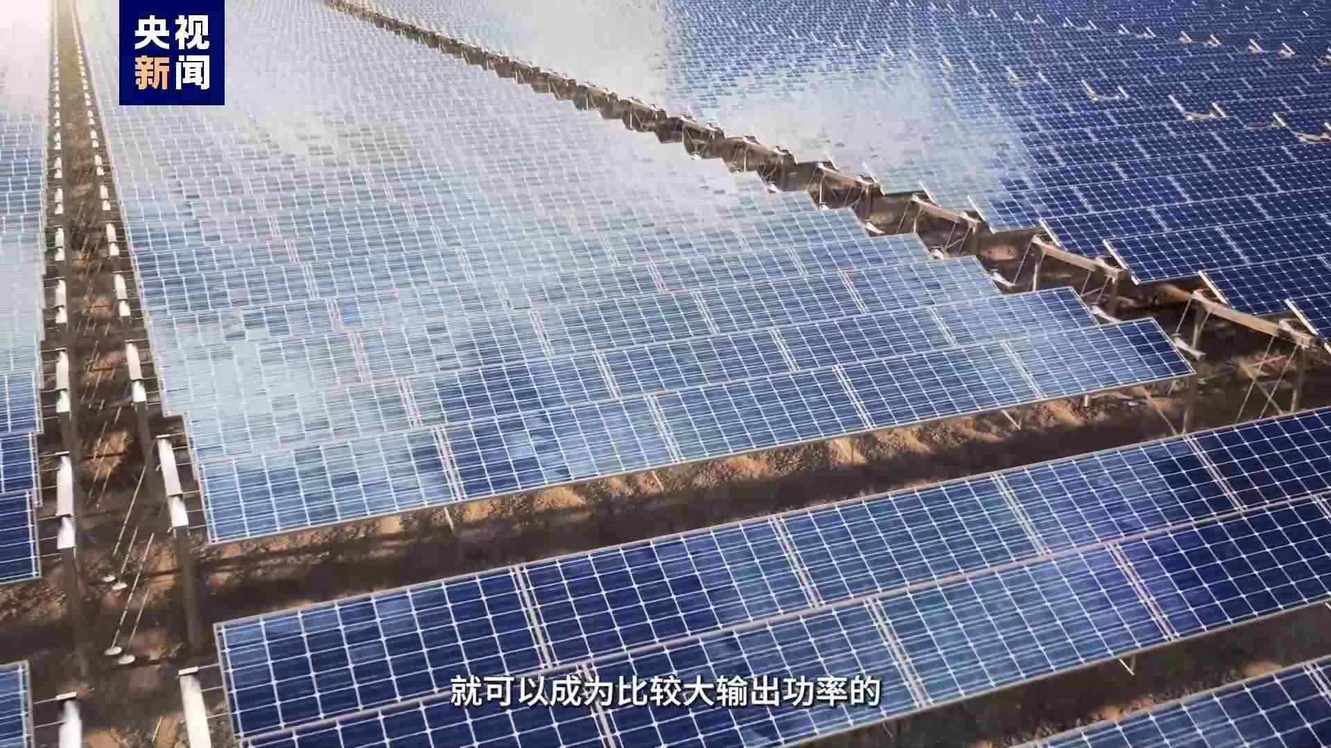 治沙完成后,陽光照射在光伏板上,源源不斷地轉(zhuǎn)換出電能,當(dāng)許許多多的光伏板聯(lián)系起來,就可以成為比較大的輸出功率的太陽能電池方陣,最后通過升壓站,將電傳輸?shù)角Ъ胰f戶。