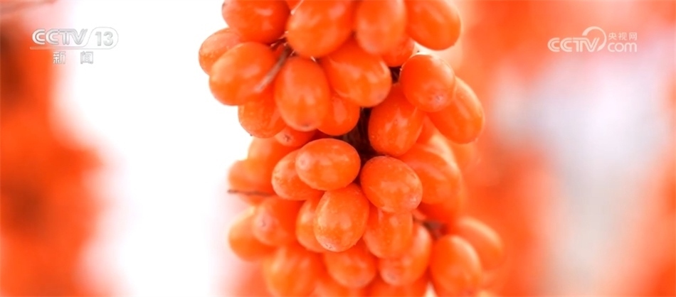 總臺記者 崔寧:我現(xiàn)在是在新疆生產(chǎn)建設兵團第九師170團的萬畝沙棘種植基地。這些小果就是已經(jīng)成熟的沙棘,我們來看,密密麻麻的,有黃豆大小,顏值非常高。我們平時熟悉的沙棘飲料、沙棘果油就是由它來生產(chǎn)的。沙棘的品種有很多,像我們現(xiàn)在看到的這種叫做大果沙棘,產(chǎn)量相對來說比較高,每畝地能夠達到平均800公斤。