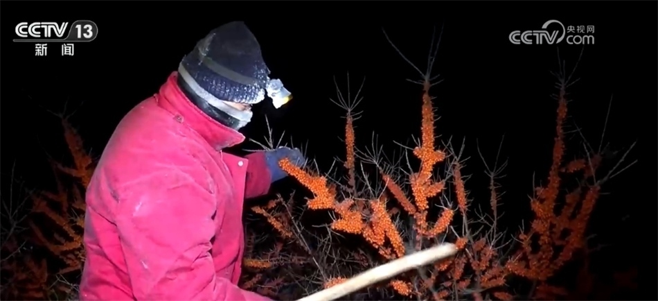 因為沙棘中含有大量的沙棘油,所以要想讓它凍到能敲下來的程度,就必須要等到氣溫非常低的時候,因此種植戶通常會選擇在最冷的季節(jié)、最冷的寒夜來采收,當?shù)厝税阉凶觥扒霉薄?/p>