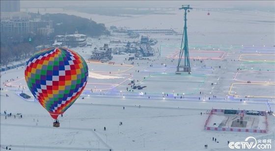 近日,哈爾濱松花江冰面上升起一個(gè)顏色鮮艷的熱氣球。
