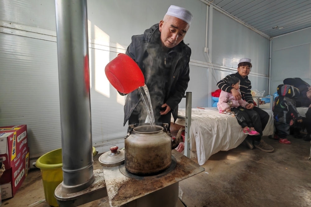 在甘肅臨夏積石山縣大河家鎮(zhèn)梅坡村活動(dòng)板房安置點(diǎn),受災(zāi)村民在活動(dòng)板房?jī)?nèi)的火爐上燒水(12月21日攝)。新華社記者 范培珅 攝
