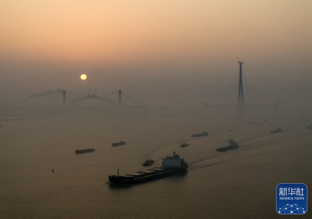 1月1日,船只在晨光中經(jīng)過位于江蘇省泰興市的常泰長江大橋建設(shè)現(xiàn)場(1月1日攝,無人機(jī)照片)。新華社發(fā)(湯德宏 攝)