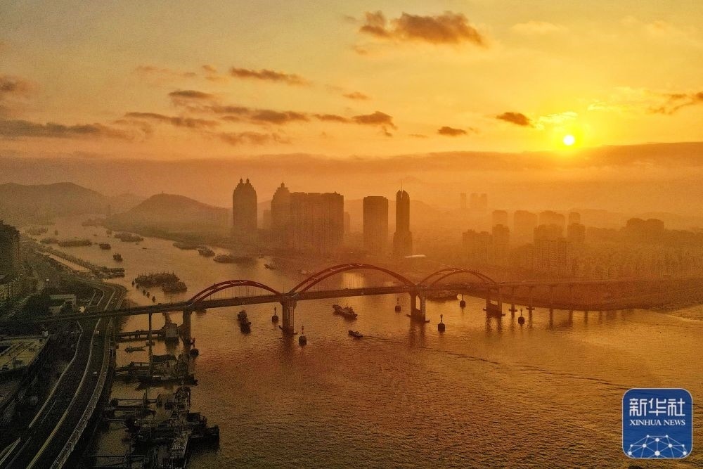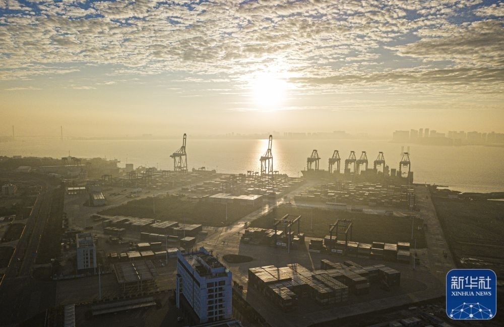 這是1月1日在海南自貿(mào)港重點(diǎn)園區(qū)——洋浦經(jīng)濟(jì)開發(fā)區(qū)拍攝的晨光(無人機(jī)照片)。新華社記者 蒲曉旭 攝