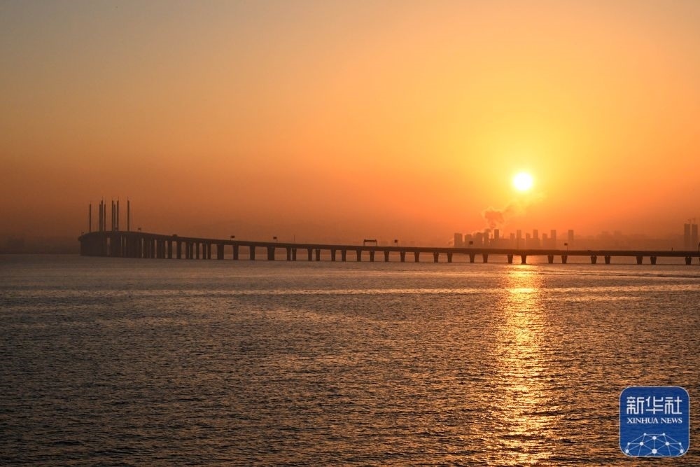 這是1月1日在山東青島膠州灣跨海大橋拍攝的日出。新華社記者 李紫恒 攝