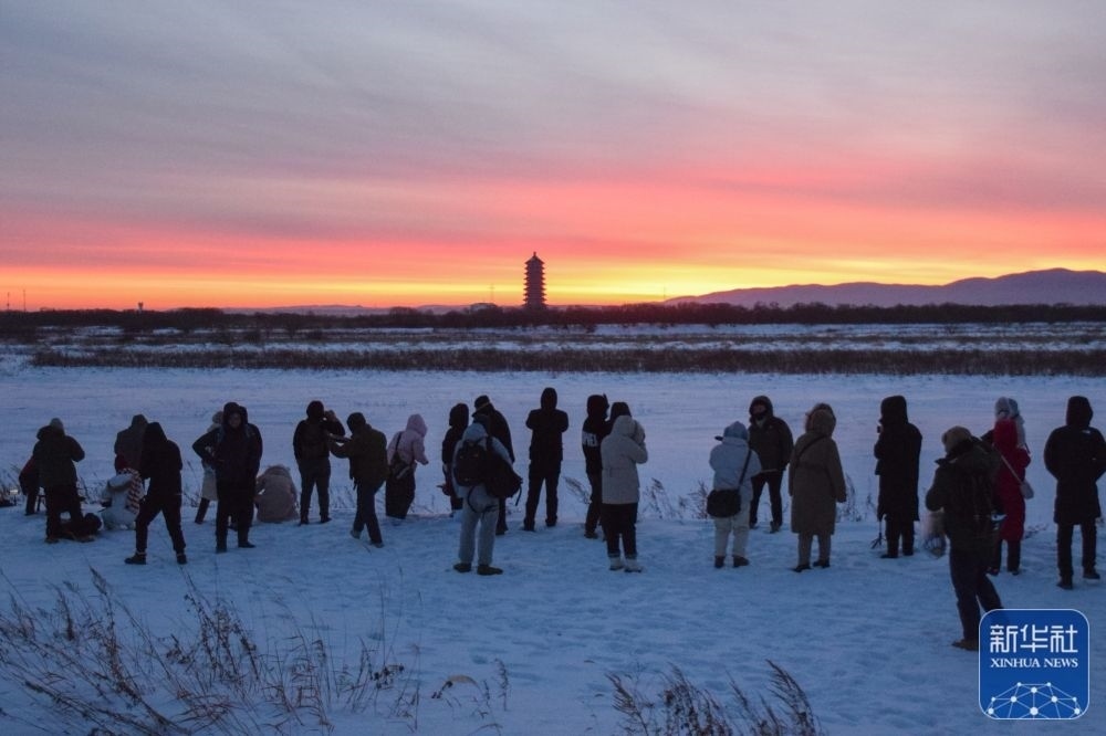 1月1日,游客在黑龍江省撫遠(yuǎn)市黑瞎子島上看日出。新華社發(fā)(官長青 攝)