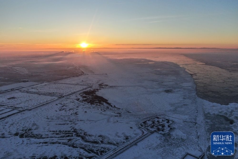 這是1月1日在遼寧省盤錦市中國石油遼河油田拍攝的日出(無人機(jī)照片)。新華社記者 潘昱龍 攝
