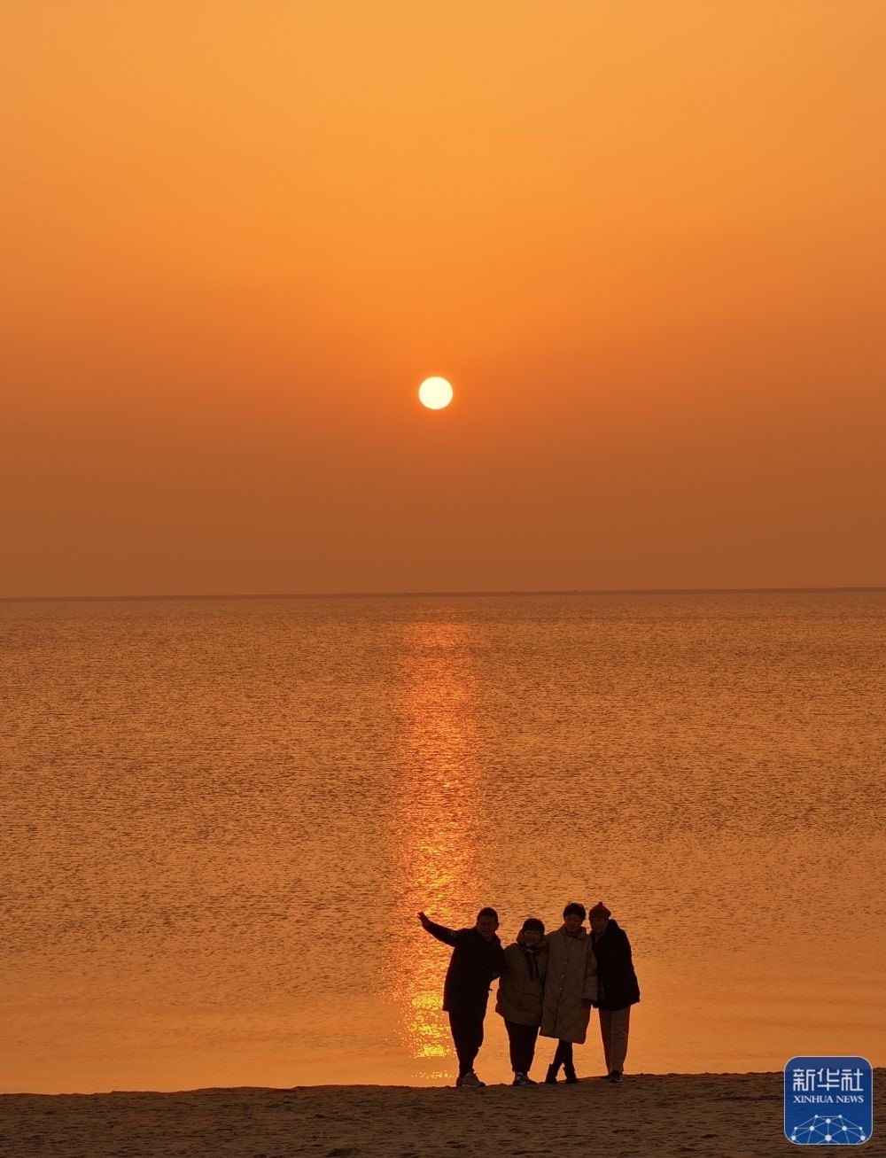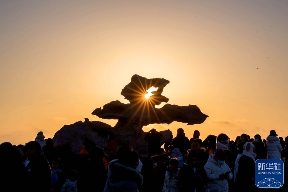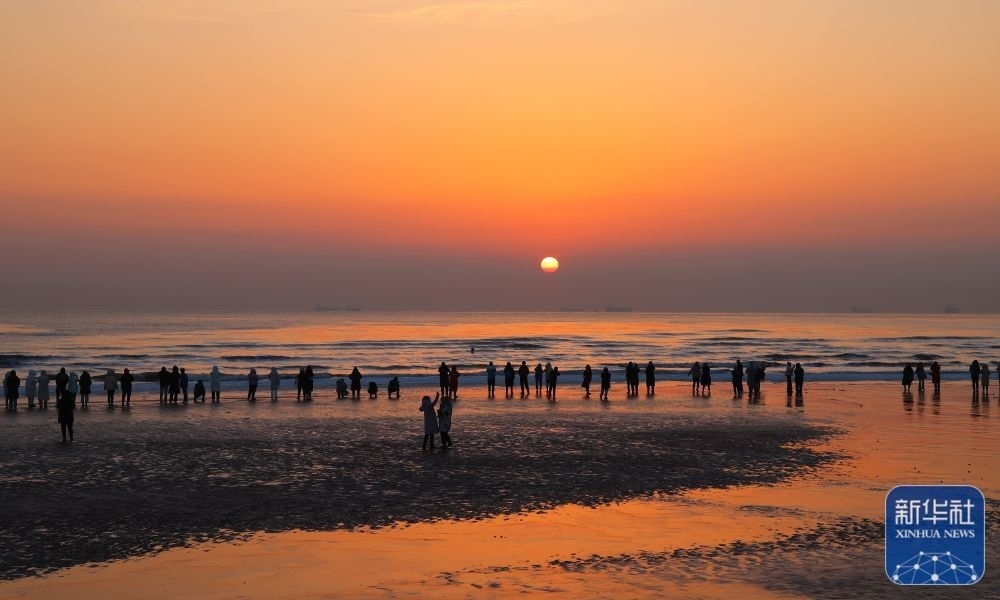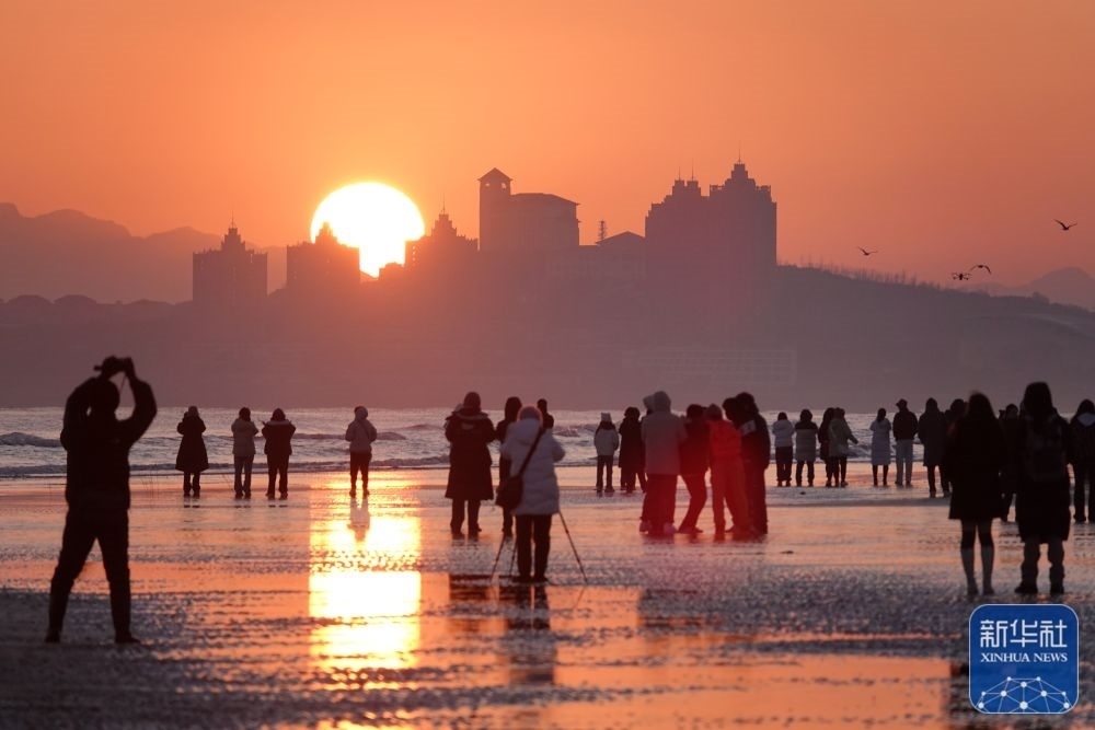 1月1日,市民在河北省秦皇島市北戴河區(qū)淺水灣浴場海灘觀看日出。新華社發(fā)(劉城 攝)