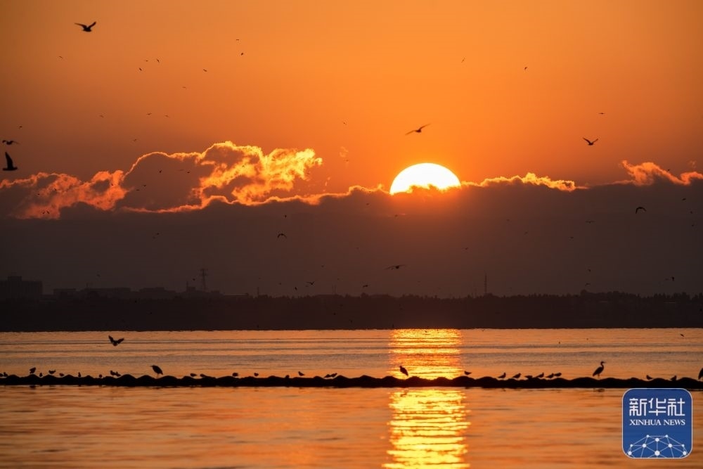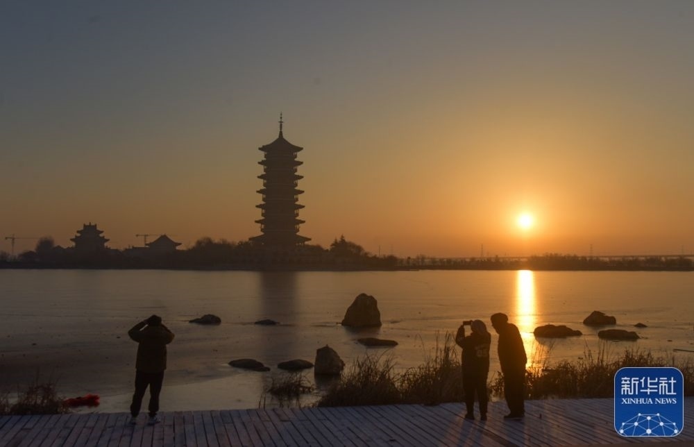 1月1日,人們在山東青島大沽河省級生態(tài)旅游度假區(qū)迎接新年日出。新華社發(fā)(王昭脈 攝)