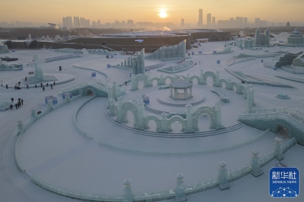 朝陽下的哈爾濱冰雪大世界園區(qū)(1月1日攝,無人機(jī)照片)。新華社記者 張濤 攝